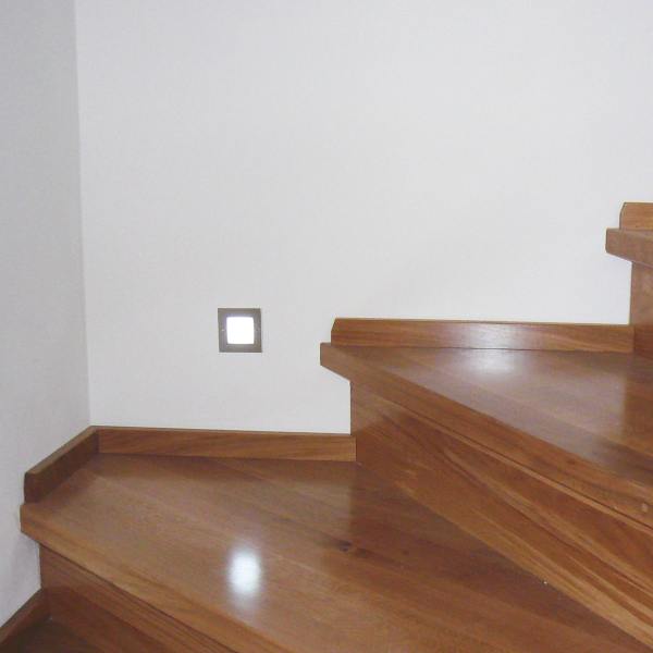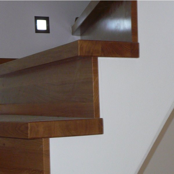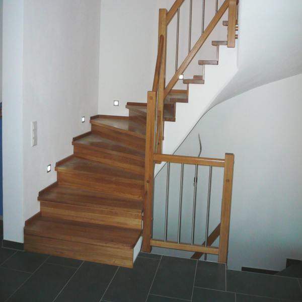 Hier wurde eine gewendelte Betontreppe über zwei Geschosse mit Tritt- und Setzstufen in Eiche Vollholz belegt.